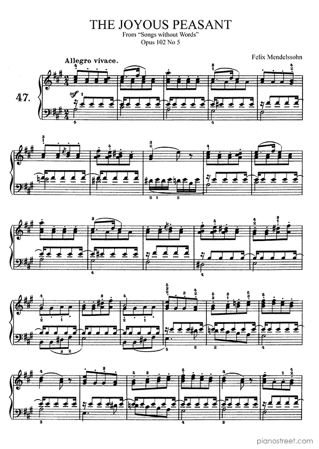 Mendelssohn: The Joyous Peasant Op. 102 No. 5 in A Major (published in 1845) . DOWNLOAD piano sheet music from Piano Street digital sheet music library.