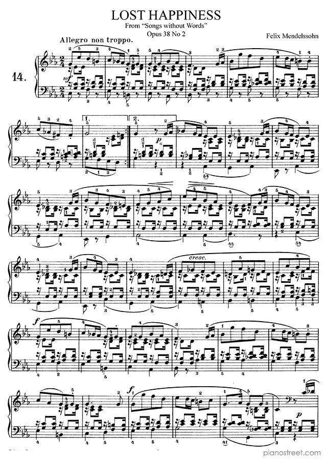 Piano sheet music and recordings. This piece is from Songs Without Words by Felix Mendelssohn: Lost Happiness Op. 38 No. 2 in C Minor (published in 1837) . Level 8, Period: Early Romantic