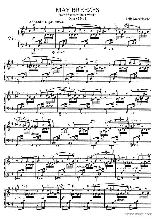 Early Romantic piano sheet music by Felix Mendelssohn to download and print instantly: May Breezes Op. 62 No. 1 in the key of . Level 6, compositional type: Piece (published in 1844)