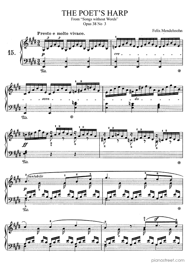 Felix Mendelssohn: The Poet's Harp Op. 38 No. 3 in E Major from Songs Without Words - piano sheet music to print instantly. This piece is level 8 and was composed during the Early Romantic period.