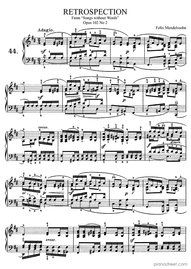 Early Romantic piano sheet music by Felix Mendelssohn to download and print instantly: Retrospection Op. 102 No. 2 in the key of . Level 7, compositional type: Piece (published in 1845)