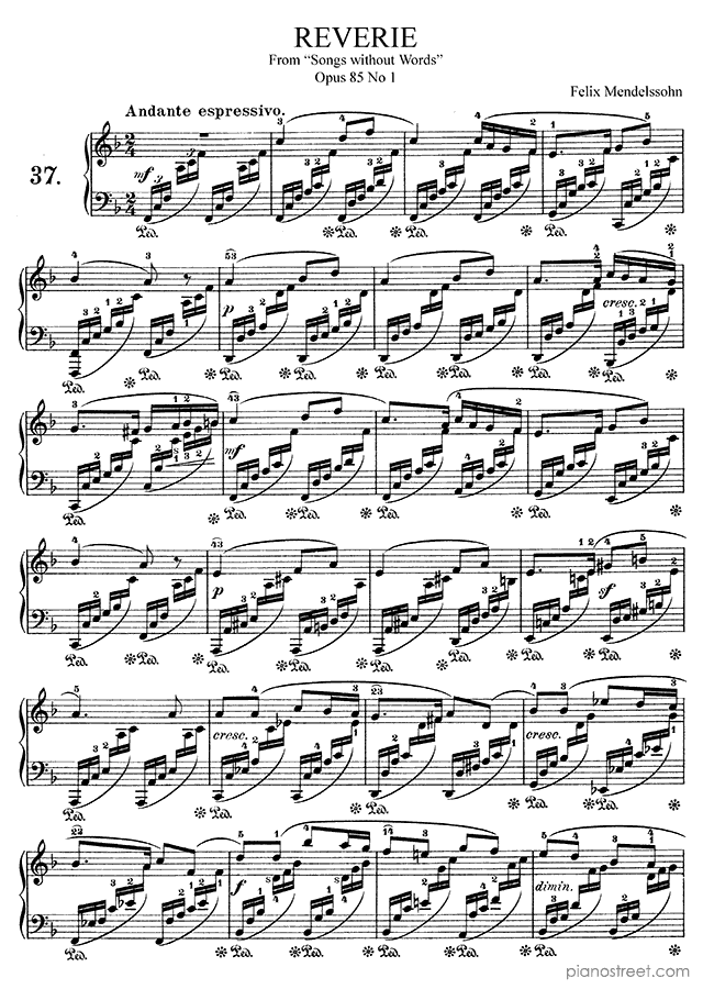 Felix Mendelssohn: Reverie Op. 85 No. 1 in F Major from Songs Without Words - piano sheet music to print instantly. This piece is level 6 and was composed during the Early Romantic period.