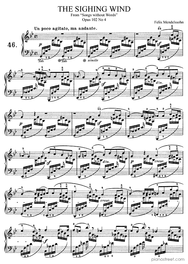 Felix Mendelssohn: The Sighing Wind Op. 102 No. 4 in G Minor from Songs Without Words - piano sheet music to print instantly. This piece is level 7 and was composed during the Early Romantic period.