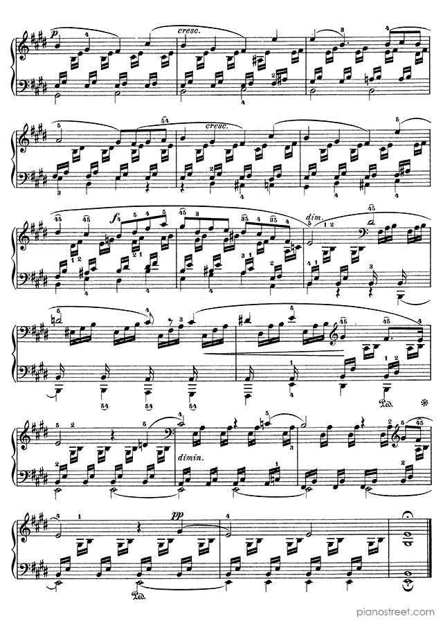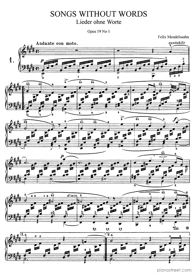 Downloadable piano sheet music from Songs Without Words by Felix Mendelssohn to print: Songs Without Words Op. 19 No. 1 in E Major (published in 1834)