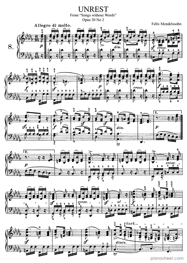 Unrest in B-flat Minor - Op. 30 No. 2 is a piano piece by the early romantic composer Felix Mendelssohn who lived between the years 1809 and 1847.