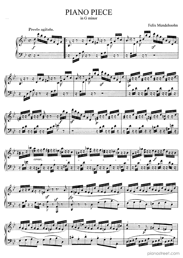 Presto agitato in G Minor No. 2 by Felix Mendelssohn. Sheet music and recordings of thousands of piano pieces by Felix Mendelssohn and many other composers to view in digital devices, print or listen to.