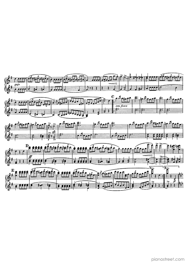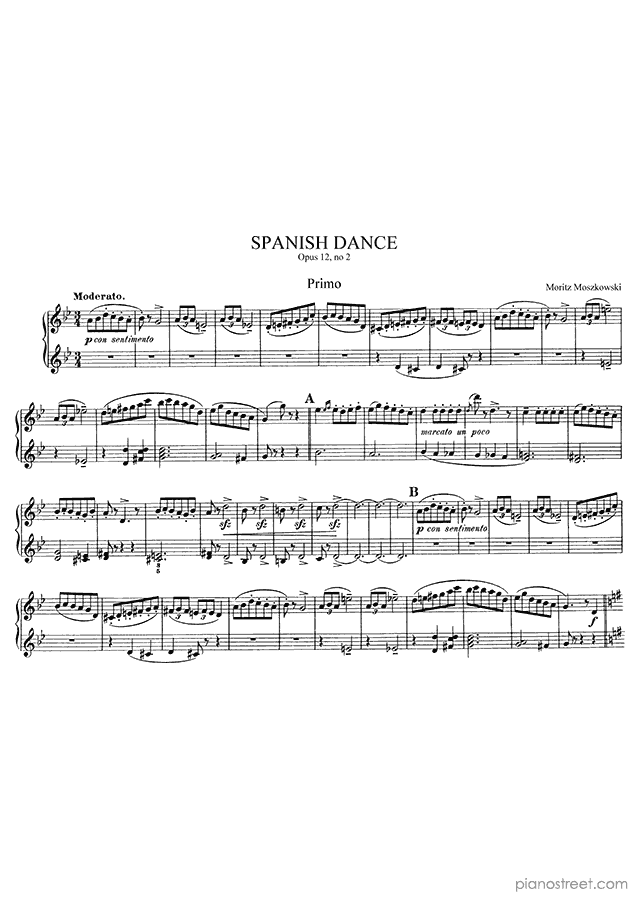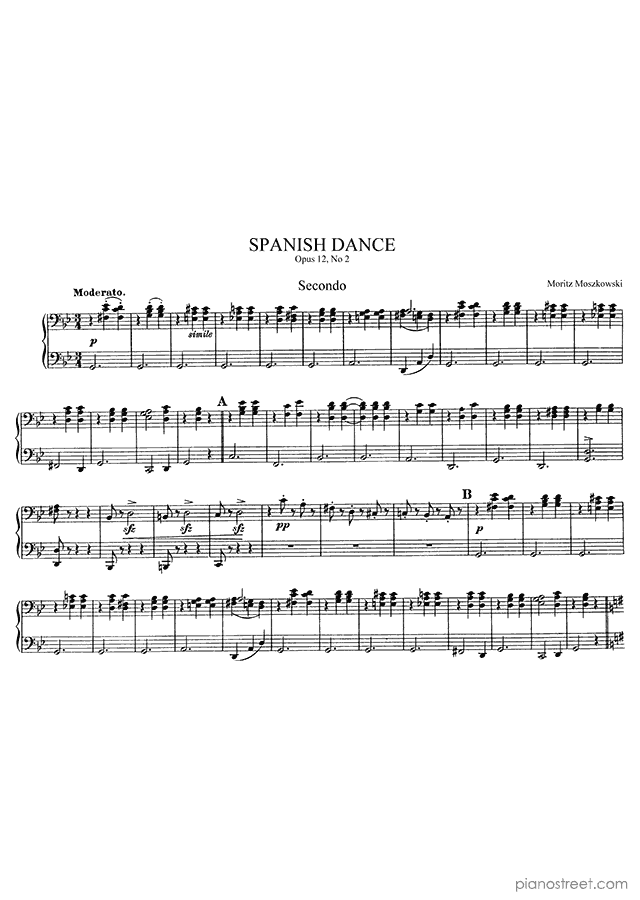 This piece is composed by Moritz MoszkowskiIt was written during the Late Romantic period. Title: Spanish Dance, Op. 12 No. 2 in G Minor from Spanish Dances (four hands). The difficulty level is around ABRSM grade 5 and it belongs to the Late Romantic period.