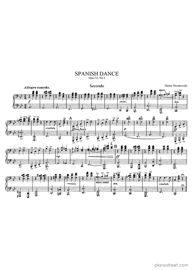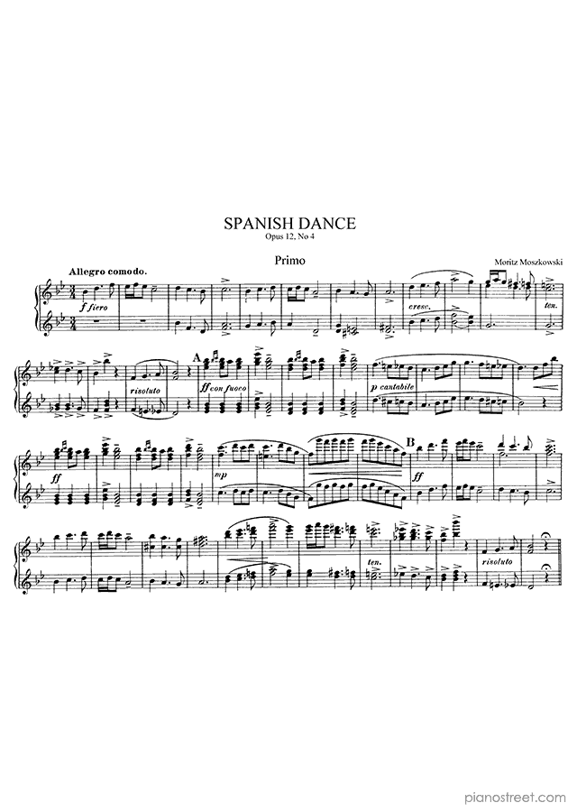 Spanish Dance in B-flat Major Op. 12 No. 4 by Moritz Moszkowski. Sheet music and recordings of thousands of piano pieces by Moritz Moszkowski and many other composers to view in digital devices, print or listen to.