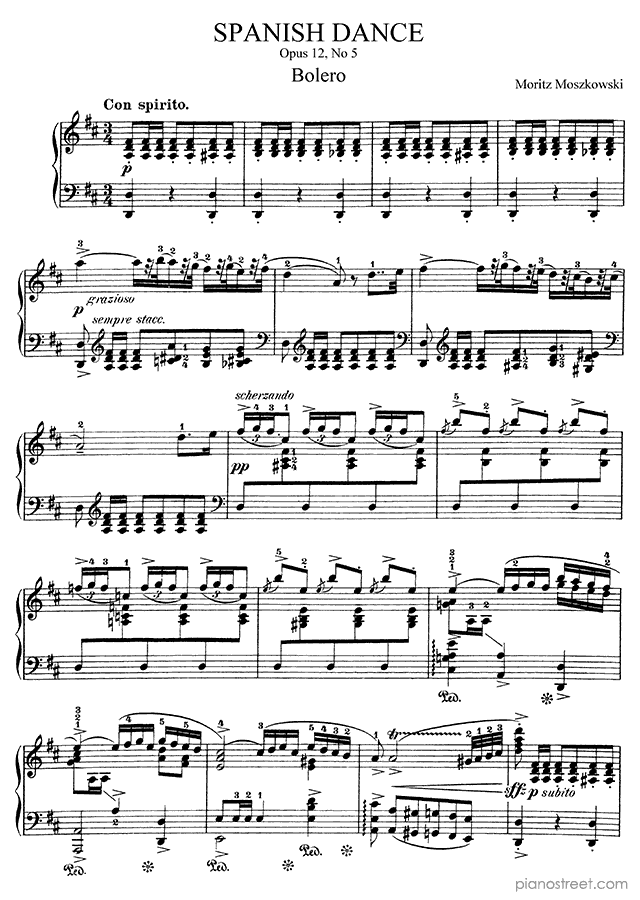 Late Romantic piano sheet music by Moritz Moszkowski to download and print instantly: Spanish Dance (Bolero) Op. 12 No. 5 in the key of . Level 8, composition type: Piece