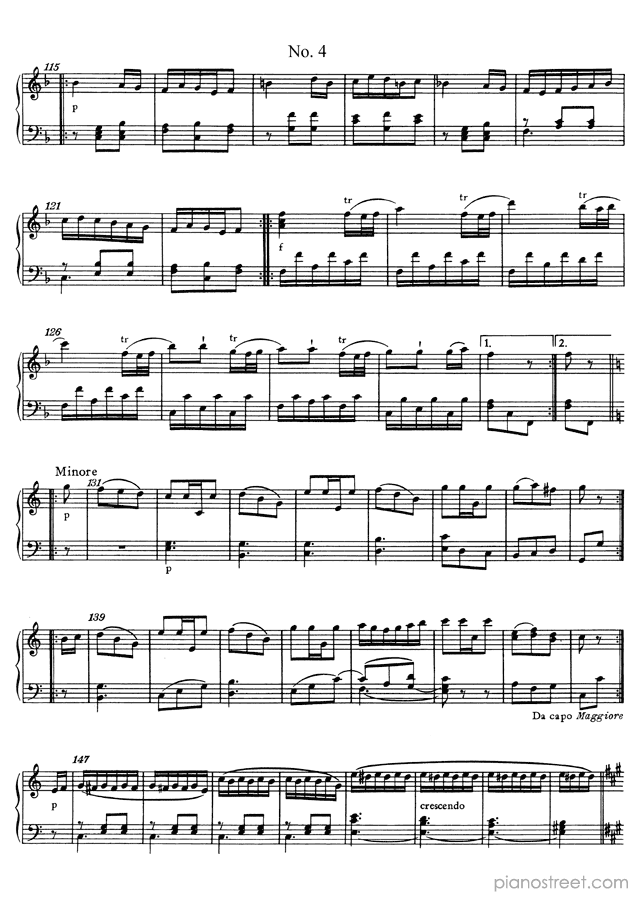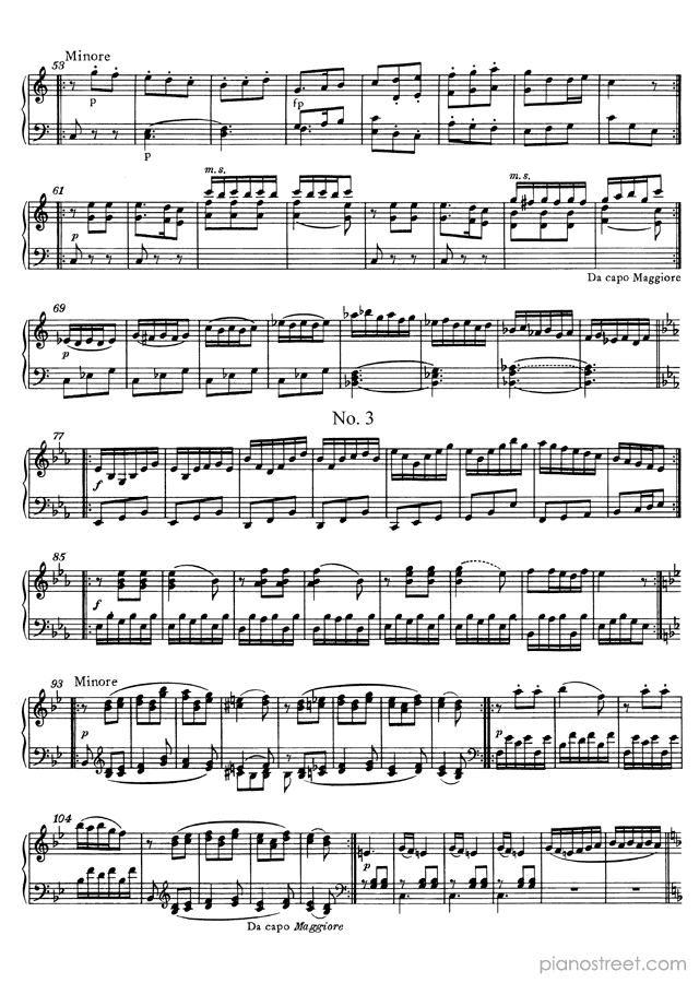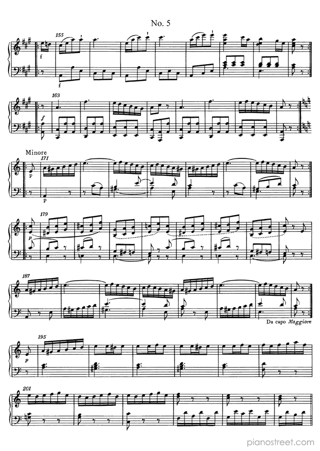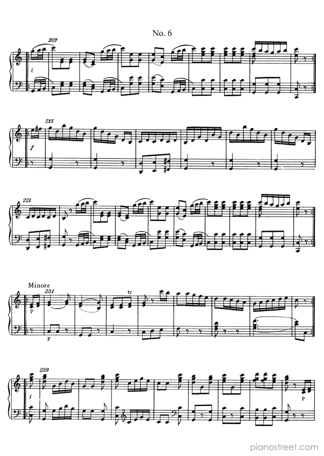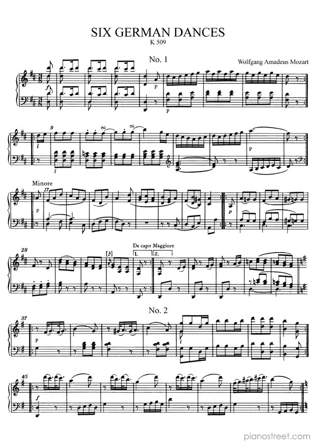 Classical piano sheet music by Wolfgang Amadeus Mozart to download and print instantly: 6 German Dances K. 509 in the key of . Level 7, compositional type: Suite (published in 1787)