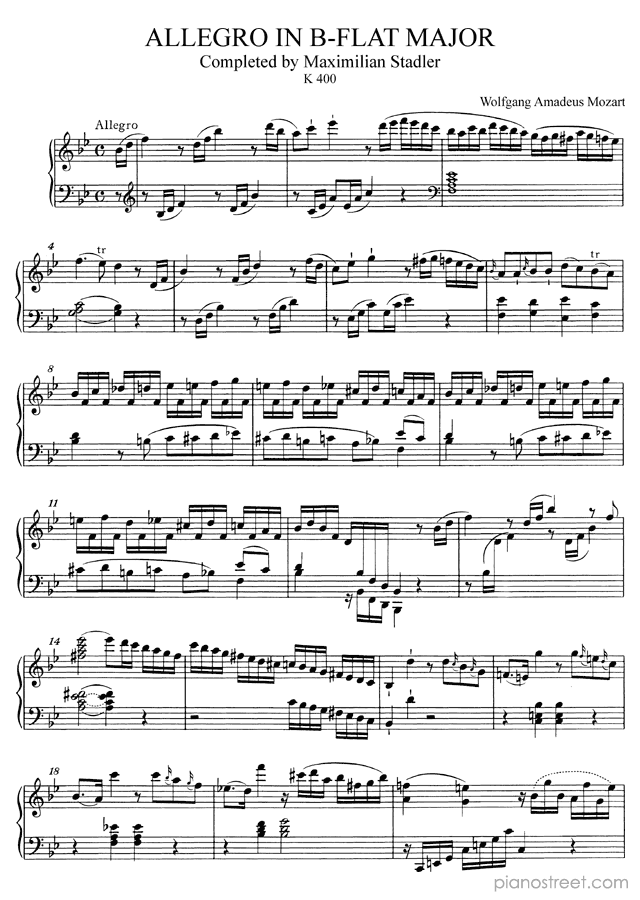 Allegro in B-flat in B-flat Major - K. 400 is a piano piece by the classical composer Wolfgang Amadeus Mozart who lived between the years 1756 and 1791.