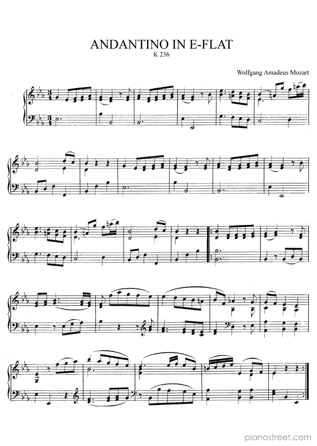 Classical piano sheet music by Wolfgang Amadeus Mozart to download and print instantly: Andantino in E-flat K. 236 in the key of . Level 4, compositional type: Piece (published in 1783)