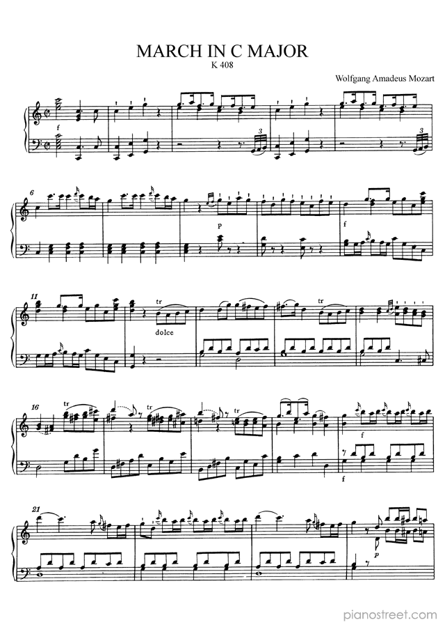 Classical piano sheet music by Mozart to download: March in C K. 408 in the key of This piece has difficulty level 5 in the category Piece