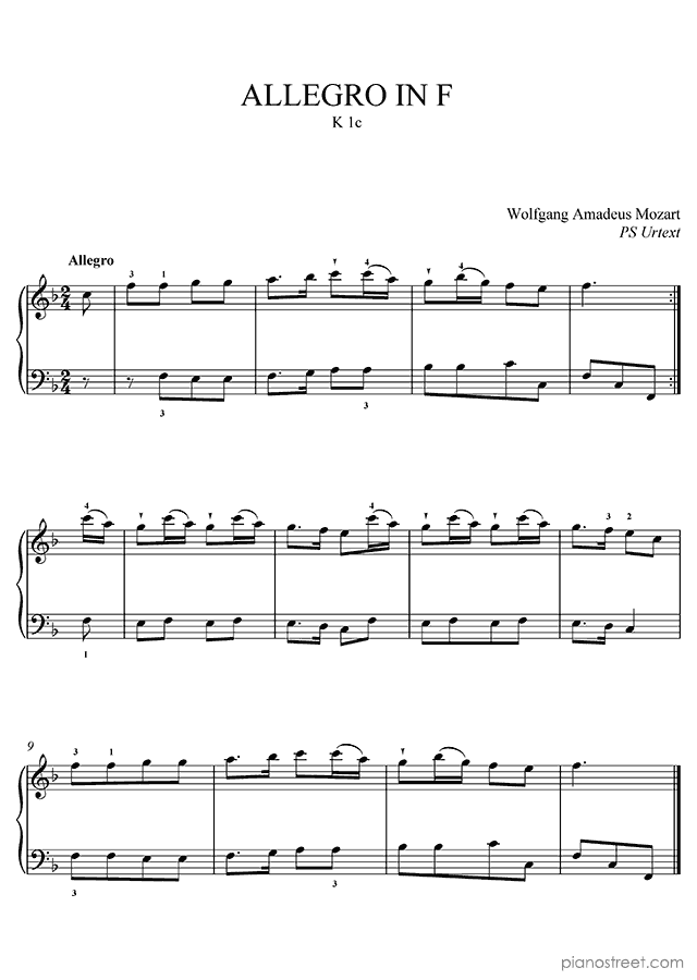 Classical piano sheet music by Wolfgang Amadéus Mozart to download and print instantly: Allegro K. 1 in the key of . Level 1, compositional type: Piece (published in 1761)