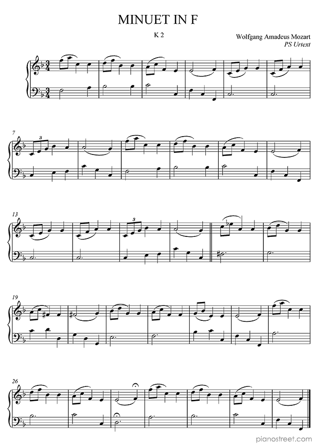 Downloadable piano sheet music by Wolfgang Amadéus Mozart to print: Minuet in F K. 2 in F Major (published in 1762)