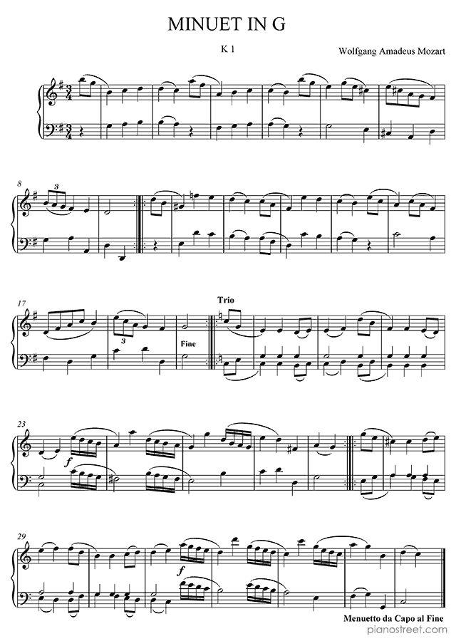 Classical piano sheet music by Mozart to download: Minuet in G K. 1 in the key of This piece has difficulty level 3 in the category Piece