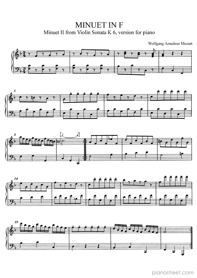 Classical piano sheet music by Wolfgang Amadeus Mozart to download and print instantly: Minuet in F K. 6 in the key of . Level 3, compositional type: Piece (published in 1762)