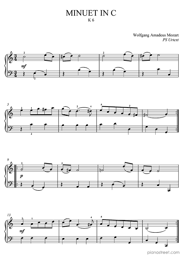 DOWNLOAD Minuet in C Major K. 6 by Wolfgang Amadéus Mozart (published in 1763) . High quality classical piano scores from the Piano Street sheet music library.