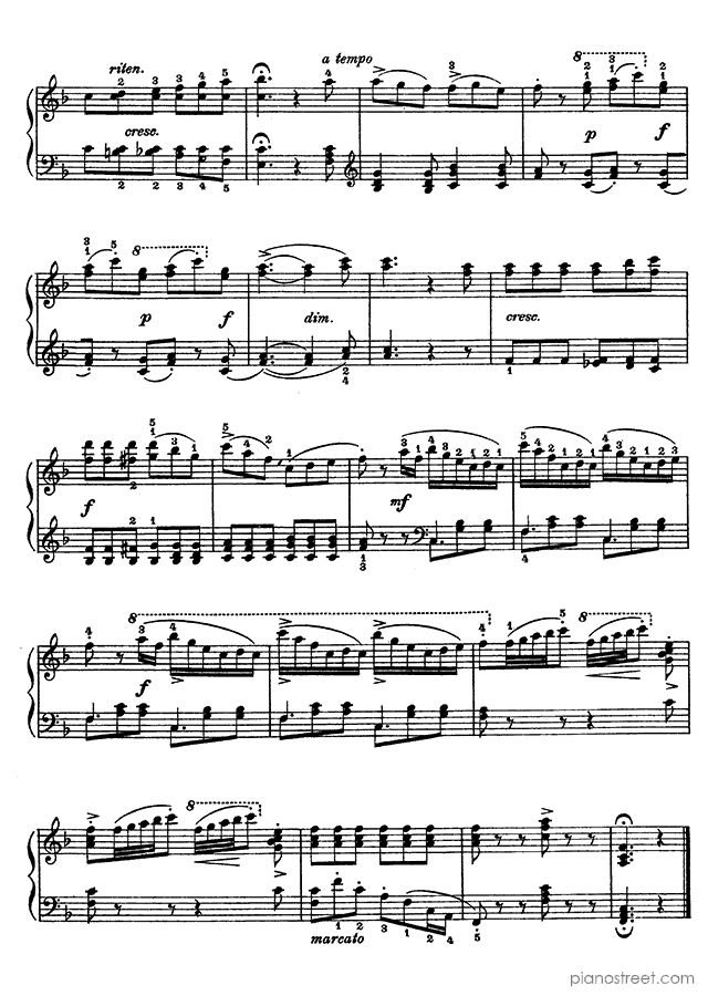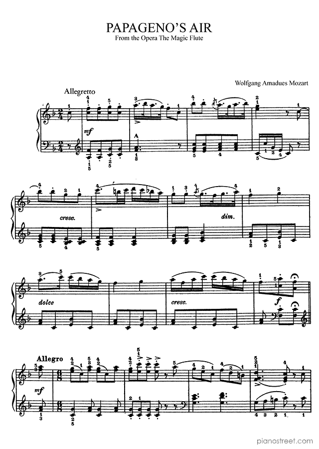 Piano sheet music and recordings. This piece is by Wolfgang Amadéus Mozart: Papageno's air from The Magic Flute in F Major (published in 1791) . Level 4, Period: Classical