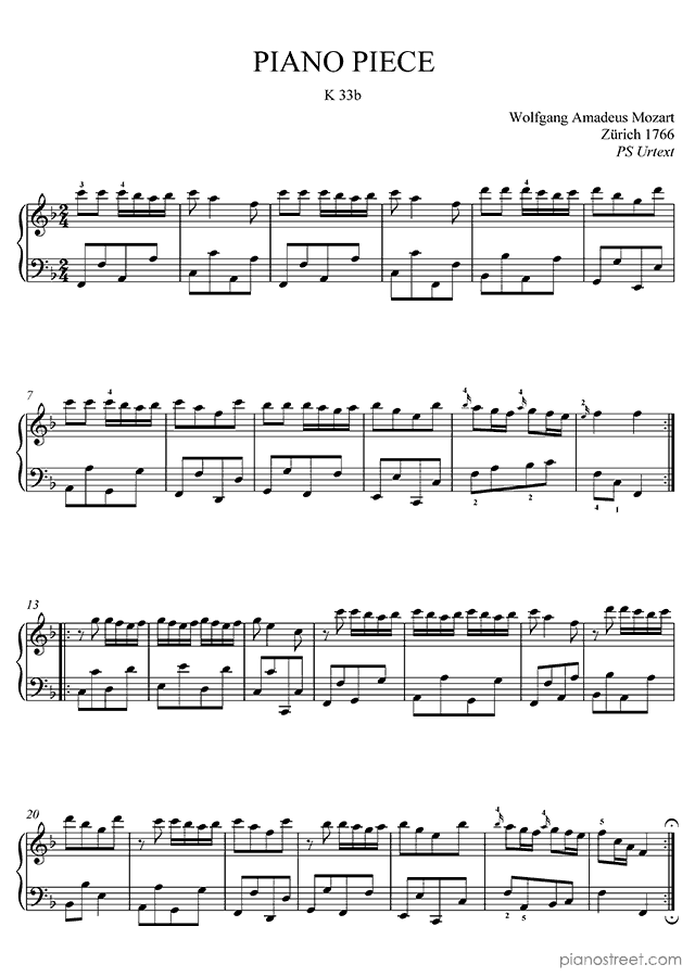 Classical piano sheet music by Mozart to download: Piano Piece K. 33 in the key of This piece has difficulty level 3 in the category Piece