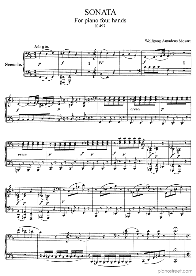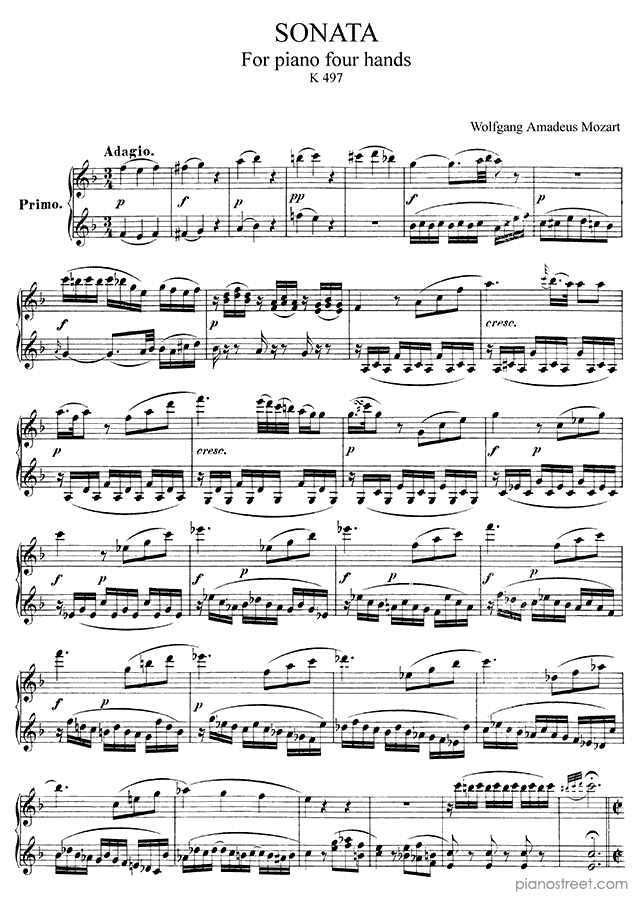 Sonata for four hands in F Major - K. 497 is a piano piece by the classical composer Wolfgang Amadéus Mozart who lived between the years 1756 and 1791.