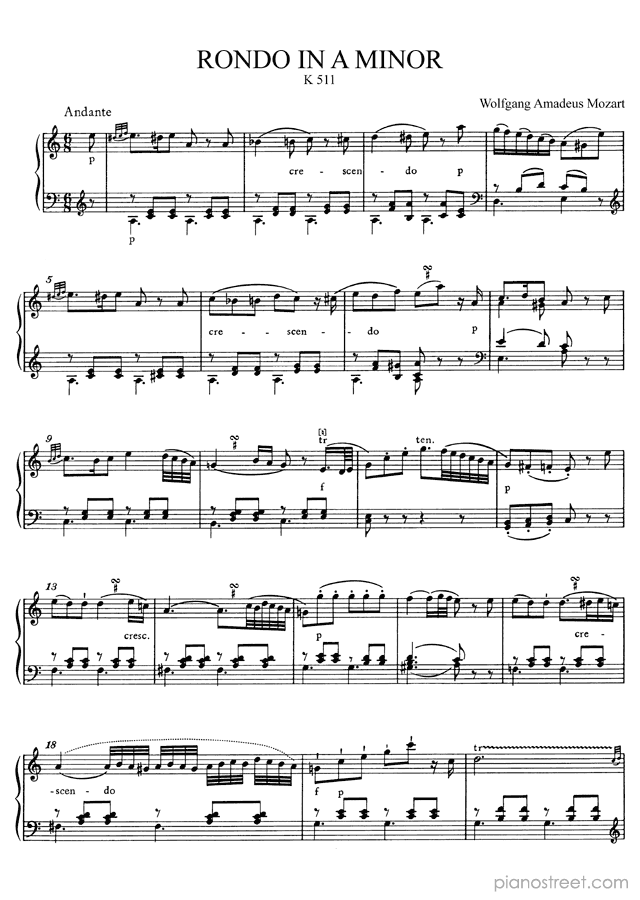 Wolfgang Amadeus Mozart: Rondo in A minor K. 511 in A Minor - piano sheet music to print instantly. This piece is level 8 and was composed during the Classical period.