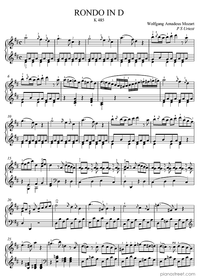 Rondo in D Major K. 485 by Wolfgang Amadéus Mozart. Sheet music and recordings of thousands of piano pieces by Wolfgang Amadéus Mozart and many other famous composers to view in your digital device, print out or listen to.