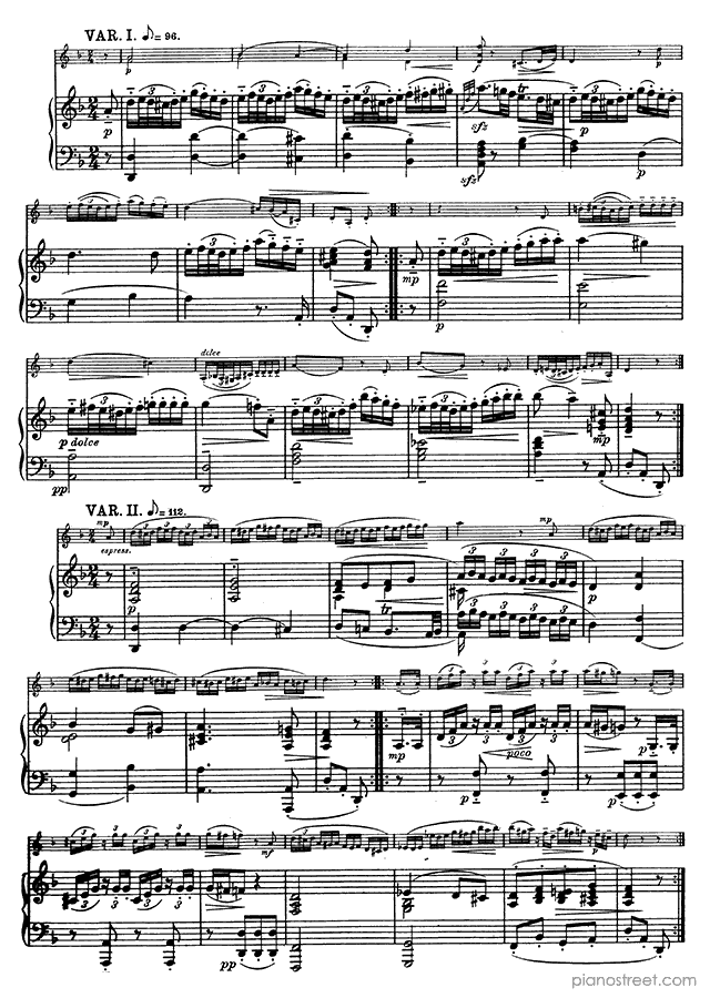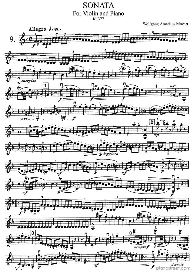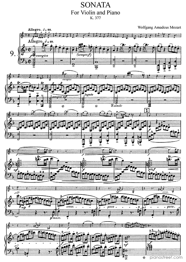 Sonata for Piano and Violin in F Major K. 377 by Wolfgang Amadéus Mozart. Sheet music and recordings of thousands of piano pieces by Wolfgang Amadéus Mozart and many other famous composers to view in your digital device, print out or listen to.