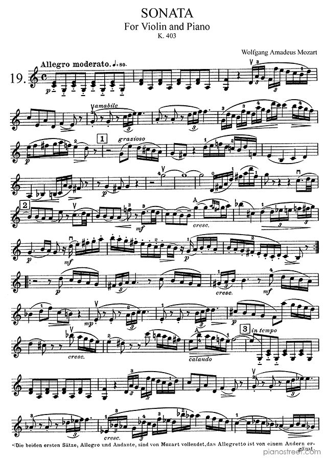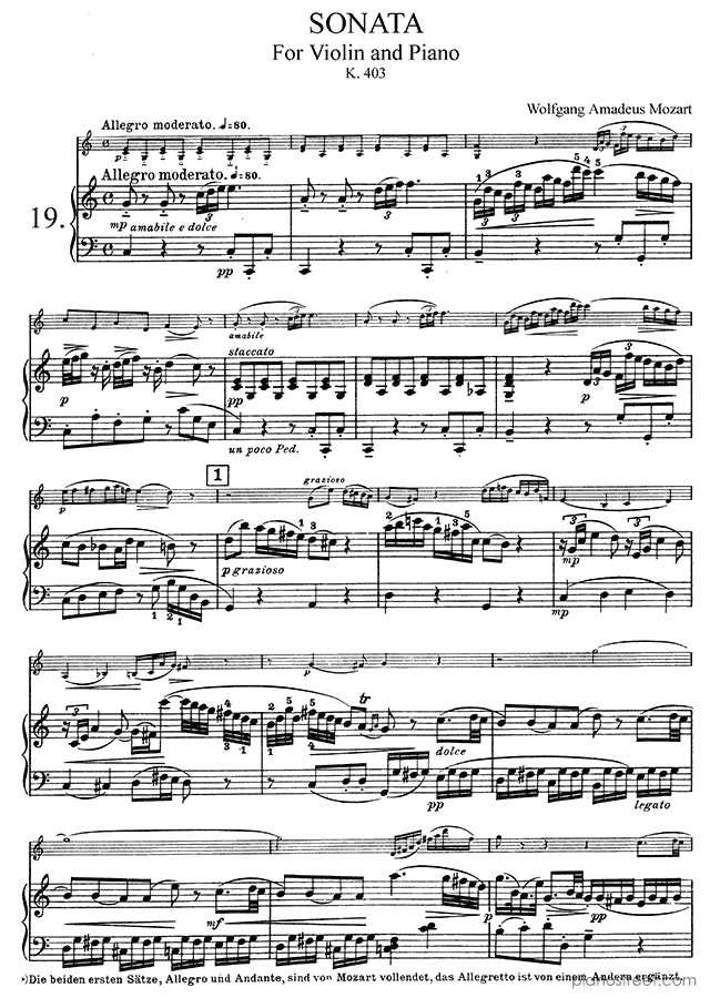 Sonata for Piano and Violin in C Major K. 403 by Wolfgang Amadéus Mozart. Sheet music and recordings of thousands of piano pieces by Wolfgang Amadéus Mozart and many other famous composers to view in your digital device, print out or listen to.