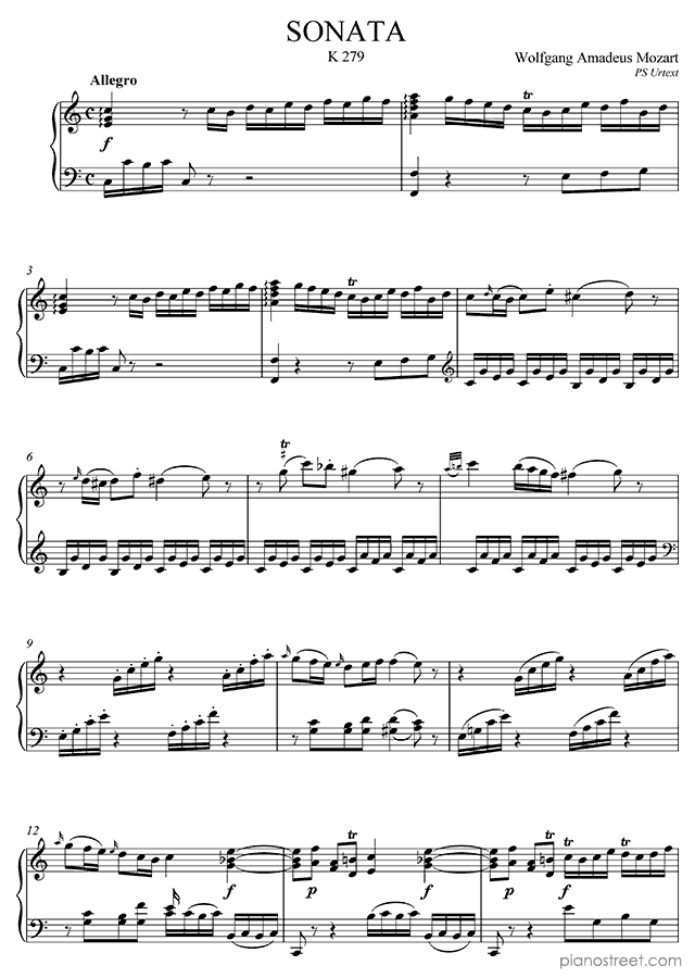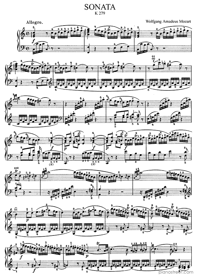 Sonata in C Major K. 279 by Wolfgang Amadéus Mozart. Sheet music and recordings of thousands of piano pieces by Wolfgang Amadéus Mozart and many other famous composers to view in your digital device, print out or listen to.