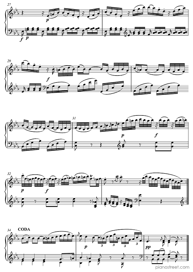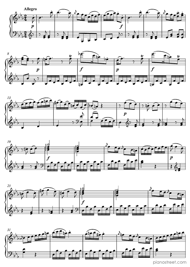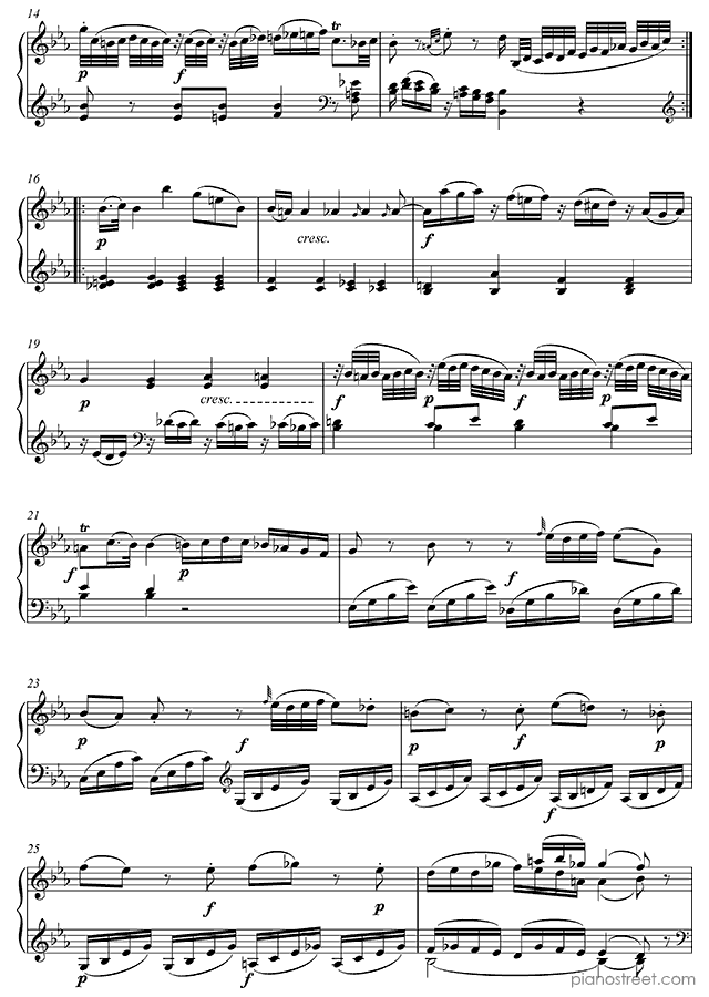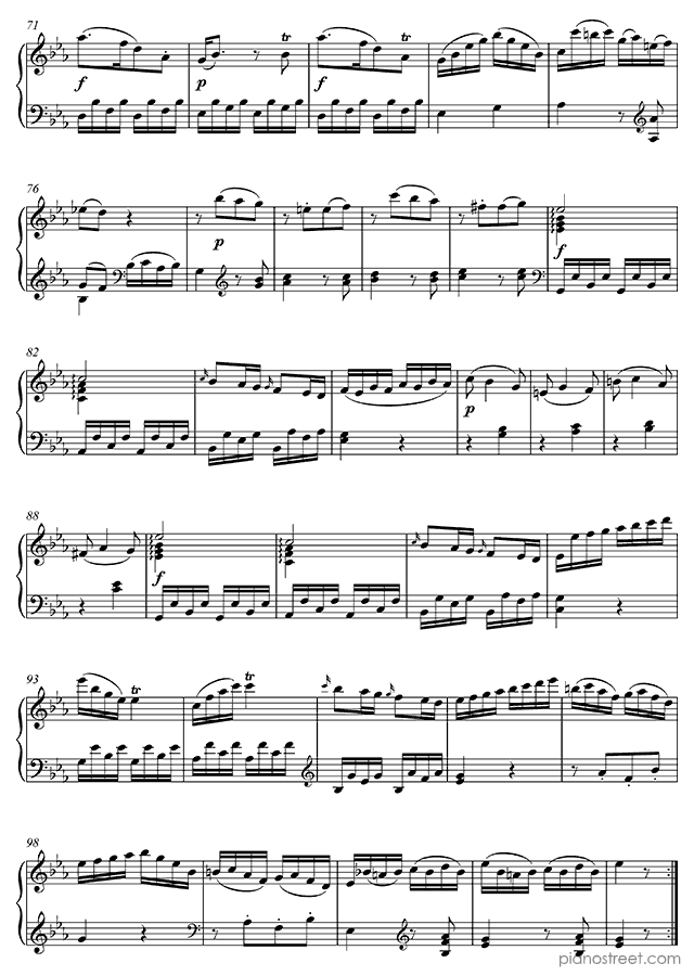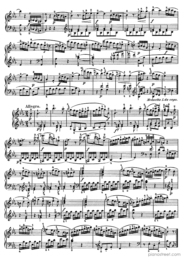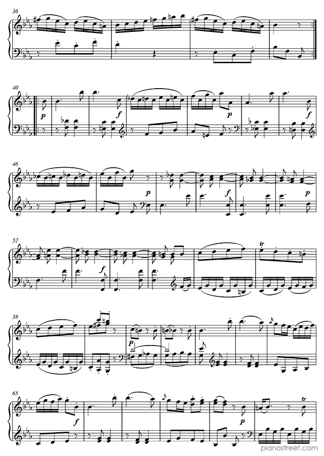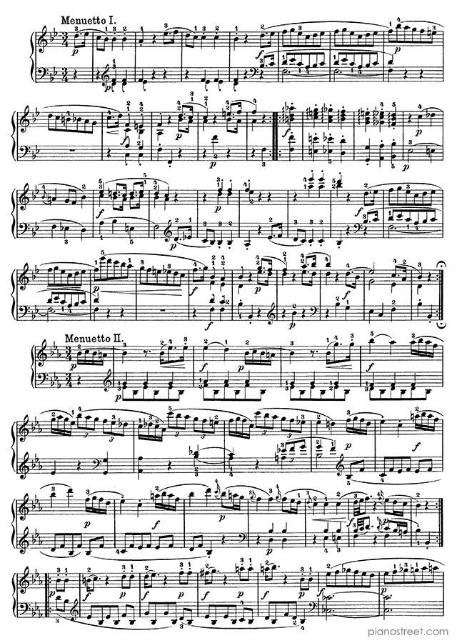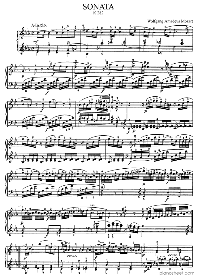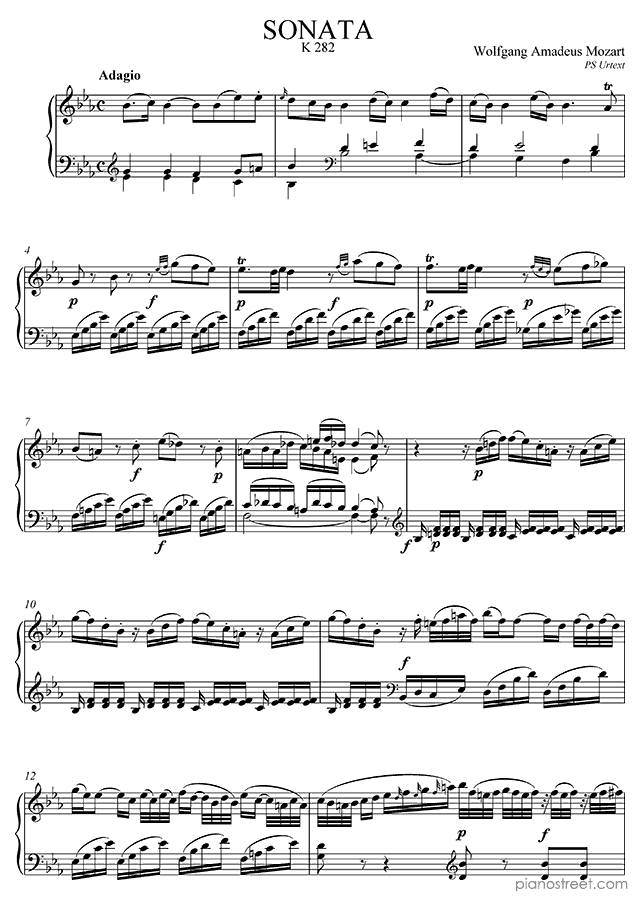 Wolfgang Amadéus Mozart, one of the prominent composers active in the Classical era, has written this piece titled Sonata K. 282 in E-flat Major from Sonatas. The composition is categorized as "Sonata" in Piano Street's sheet music library and the level of difficulty is 7.