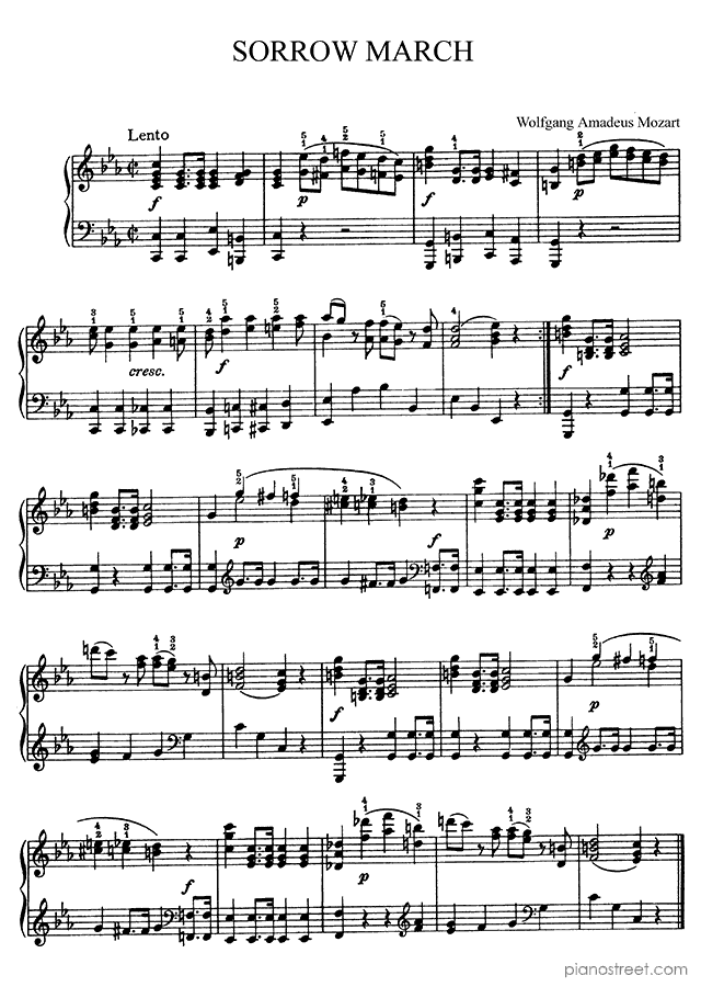 Classical piano sheet music by Wolfgang Amadéus Mozart to download and print instantly: Sorrow March (453a) K. 453 in the key of . Level 3, compositional type: Piece (published in 1784)