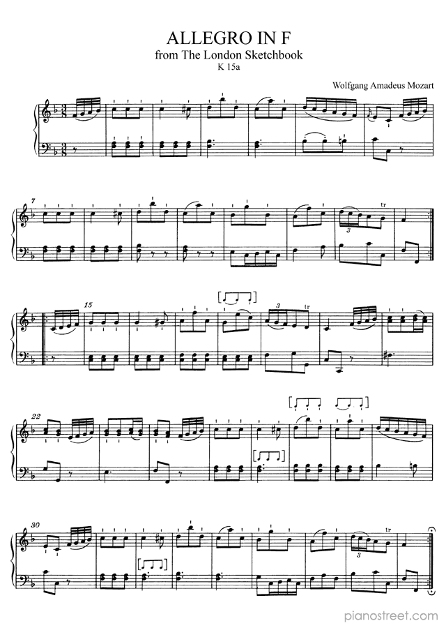 Allegro in F in F Major No. 1 by Wolfgang Amadeus Mozart. Sheet music and recordings of thousands of piano pieces by Wolfgang Amadeus Mozart and many other famous composers to view in your digital device, print out or listen to.