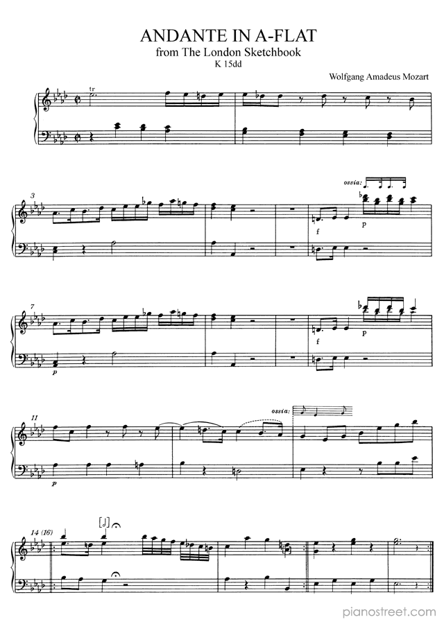 Classical piano sheet music by Wolfgang Amadeus Mozart to download and print instantly: Andante in A-flat No. 30 in the key of . Level 5, compositional type: Piece (published in 1764)