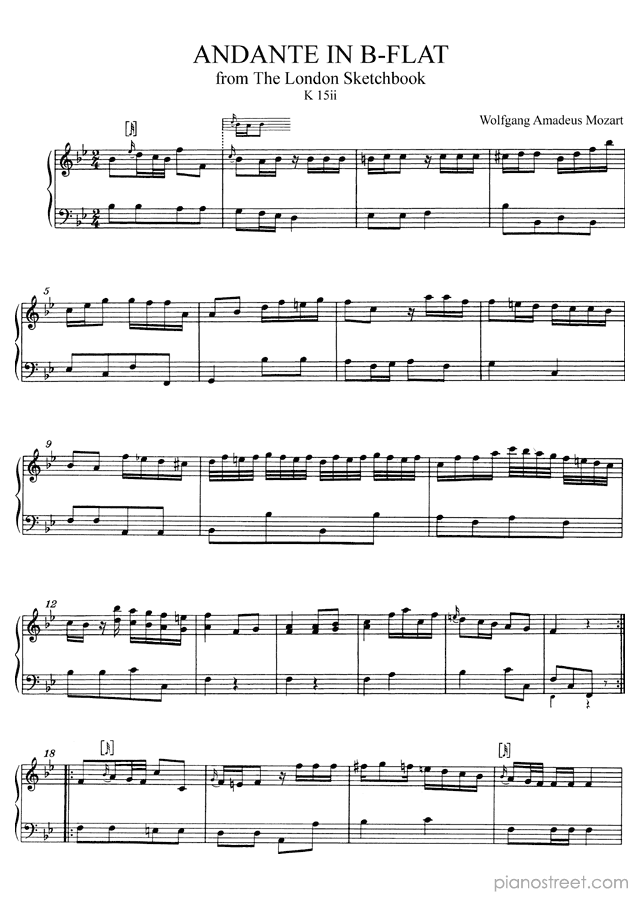 Andante in B-flat in B-flat Major No. 35 by Wolfgang Amadeus Mozart. Sheet music and recordings of thousands of piano pieces by Wolfgang Amadeus Mozart and many other famous composers to view in your digital device, print out or listen to.