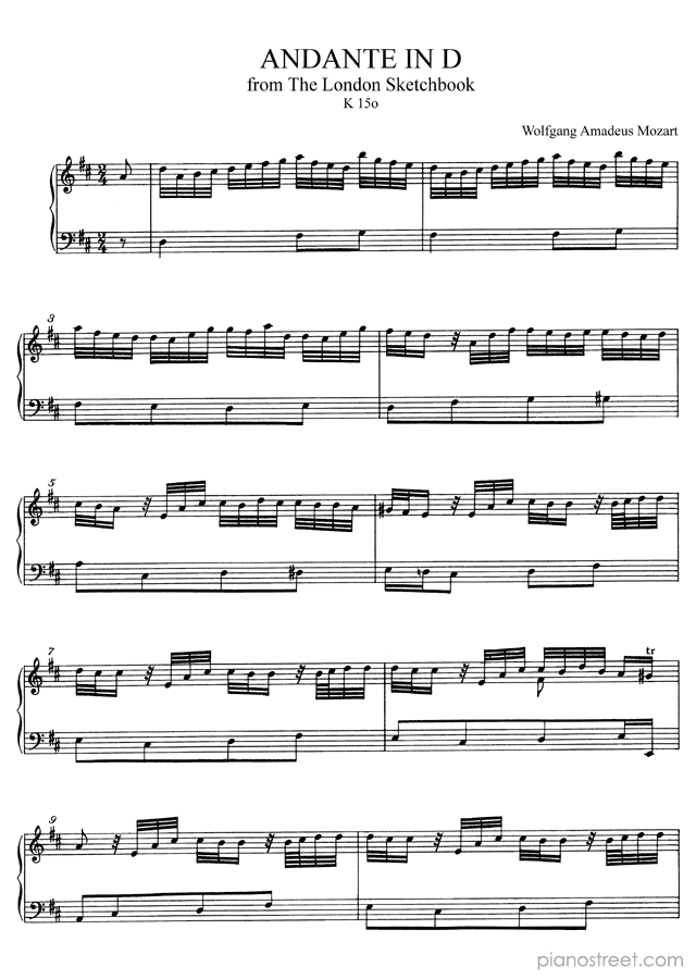 DOWNLOAD Andante in D in D Major No. 14 by Wolfgang Amadeus Mozart (published in 1764) . High quality classical piano scores from the Piano Street sheet music library.