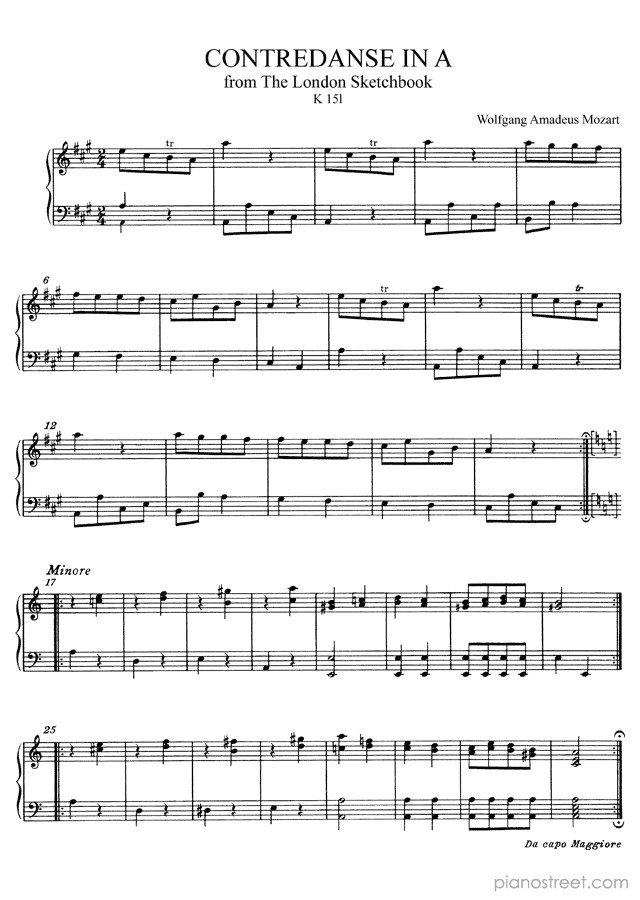 Contredanse in A in A Major No. 11 by Wolfgang Amadeus Mozart. Sheet music and recordings of thousands of piano pieces by Wolfgang Amadeus Mozart and many other famous composers to view in your digital device, print out or listen to.
