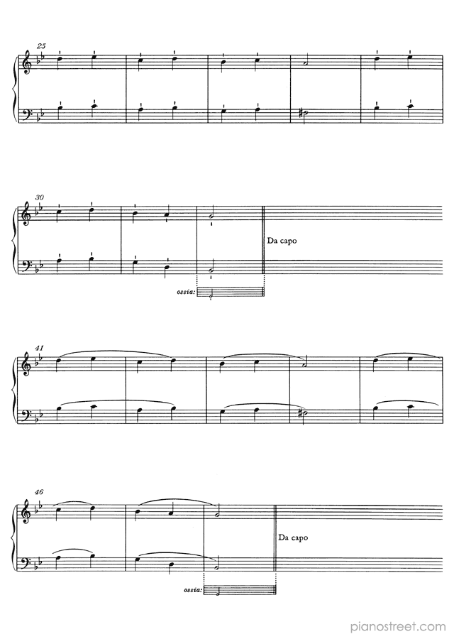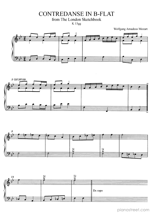 Mozart: Contredanse in B-flat No. 33 in B-flat Major (published in 1764) . DOWNLOAD piano sheet music from Piano Street digital sheet music library.