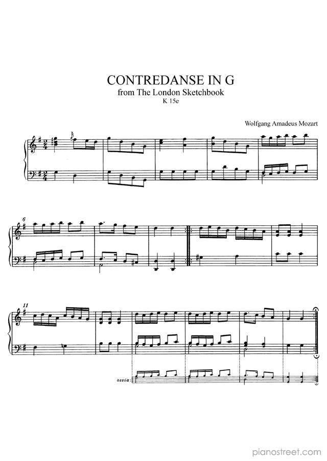 Downloadable piano sheet music from The London Sketchbook by Wolfgang Amadeus Mozart to print: Contredanse in G No. 5 in G Major (published in 1764)