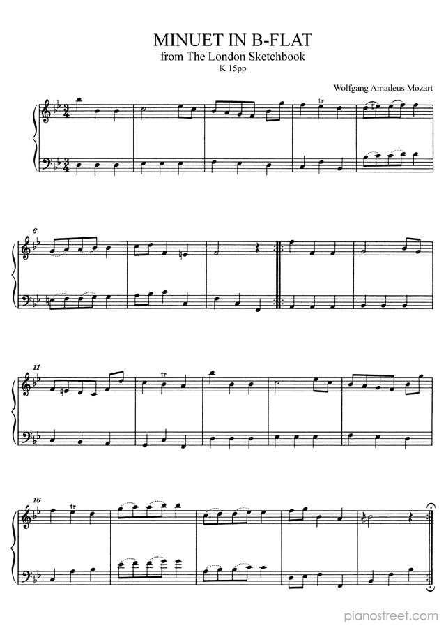 Downloadable piano sheet music from The London Sketchbook by Wolfgang Amadeus Mozart to print: Minuet in B-flat No. 41 in B-flat Major (published in 1764)