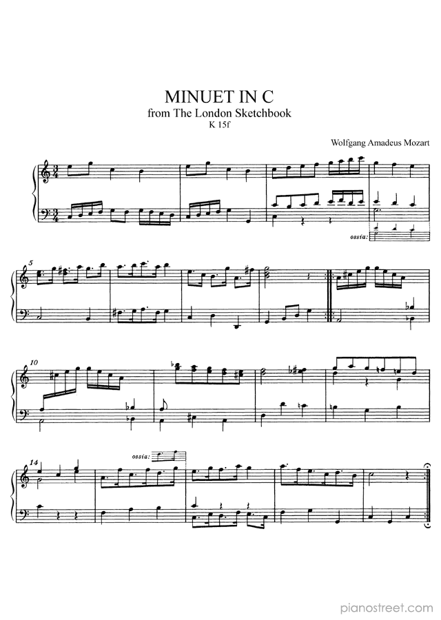 Minuet in C No. 6 in C Major, a composition by the classical composer Wolfgang Amadeus Mozart who was born in 1756 and died in 1791. The piano score of this piece was first published in 1764 and is part of Mozart's The London Sketchbook.