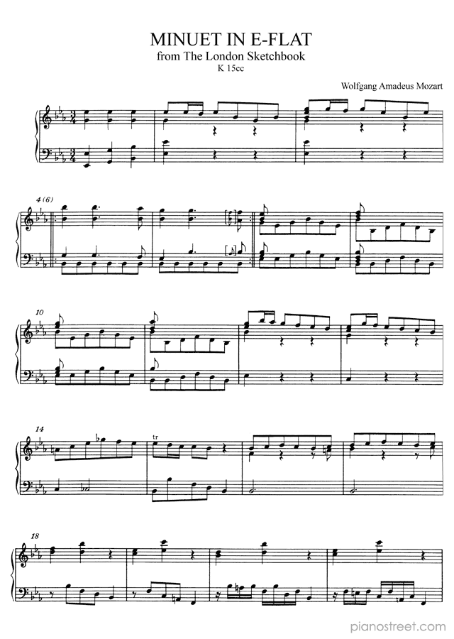 Minuet in E-flat No. 29 in E-flat Major, a composition by the classical composer Wolfgang Amadeus Mozart who was born in 1756 and died in 1791. The piano score of this piece was first published in 1764 and is part of Mozart's The London Sketchbook.