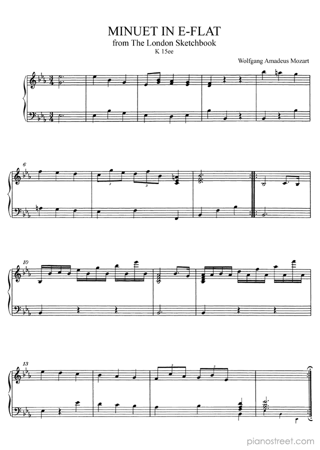 Piano sheet music and recordings. This piece is from The London Sketchbook by Wolfgang Amadeus Mozart: Minuet in E-flat No. 31 in E-flat Major (published in 1764) . Level 4, Period: Classical