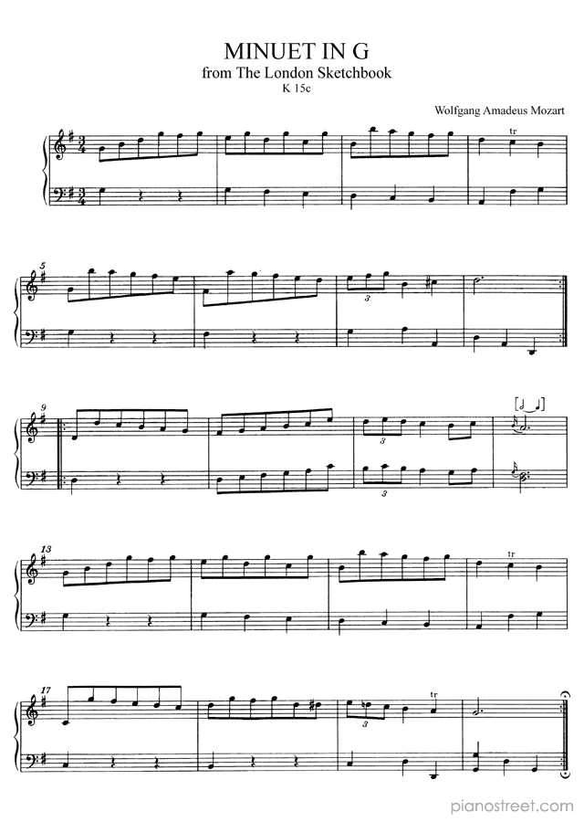DOWNLOAD: Wolfgang Amadeus Mozart - Minuet in G No. 3 in G Major ( from The London Sketchbook by Mozart). Piano sheet music to print immediately or to view in mobile devices.