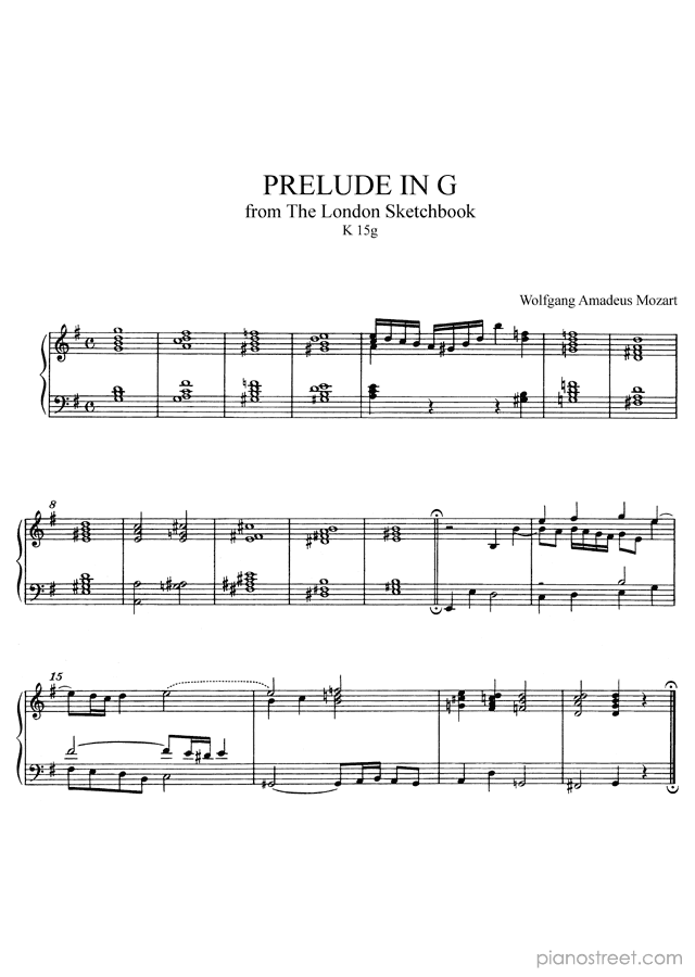 Classical piano sheet music by Wolfgang Amadeus Mozart to download and print instantly: Prelude in G No. 7 in the key of . Level 5, compositional type: Piece (published in 1764)