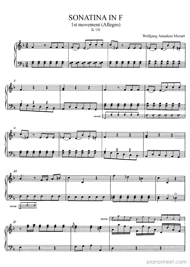 Wolfgang Amadeus Mozart: Sonatina in F No. 20 in F Major from The London Sketchbook - piano sheet music to print instantly. This piece is level 7 and was composed during the Classical period.