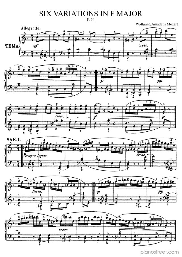 Piano sheet music and recordings. This piece is from Variations by Wolfgang Amadeus Mozart: 6 Variations K. 54 in F Major (published in 1788) . Level 7, Period: Classical