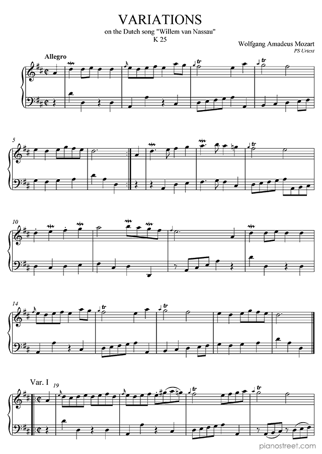 DOWNLOAD 7 Variations on Willem van Nassau in D Major K. 25 by Wolfgang Amadéus Mozart (published in 1766) . High quality classical piano scores from the Piano Street sheet music library.