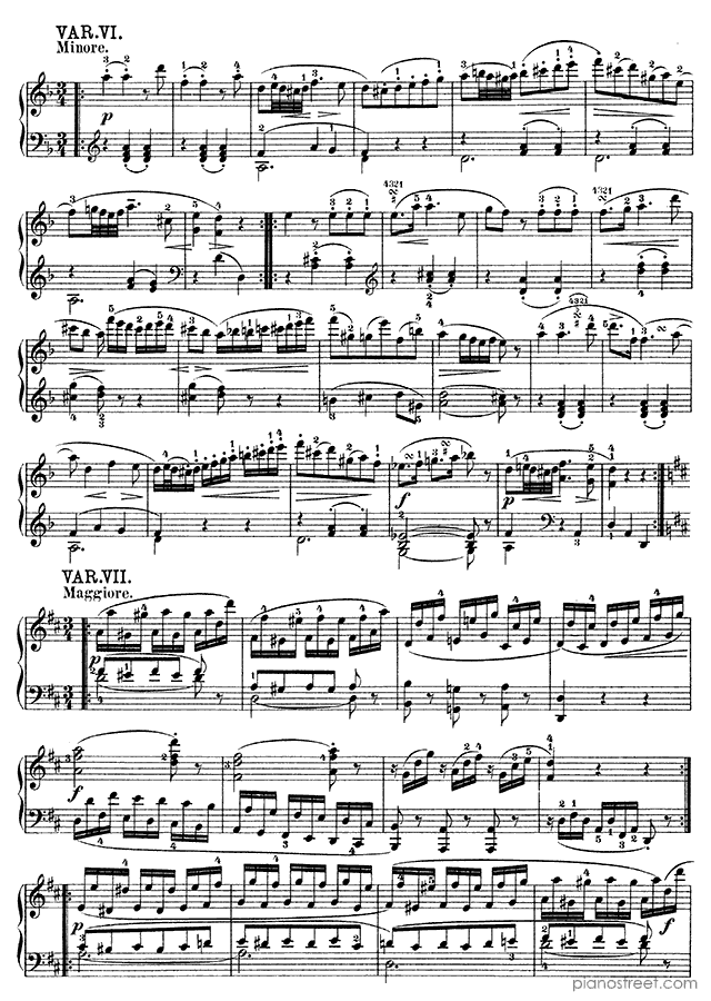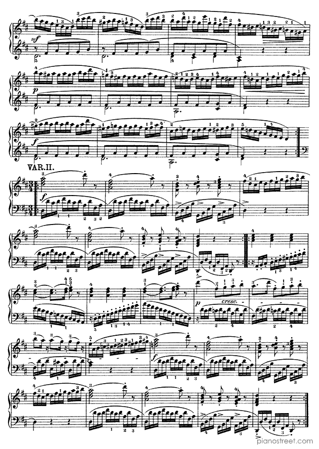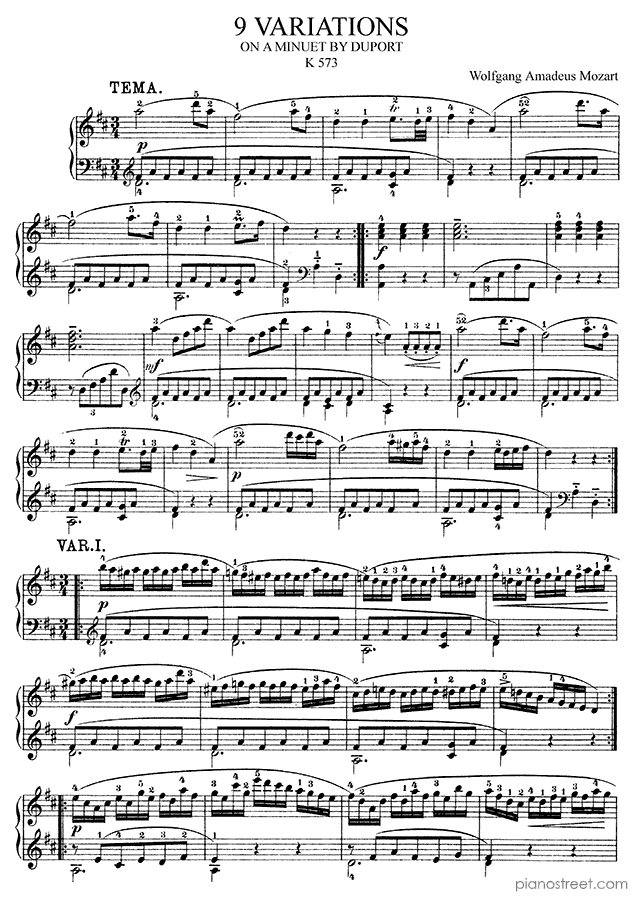 This piece is composed by Wolfgang Amadéus Mozart and was published in 1789. Title: 9 Variations on a minuet by Duport, K. 573 in D Major from Variations. The difficulty level if graded by ABRSM would be approximately 8+ and it belongs to the Classical period.