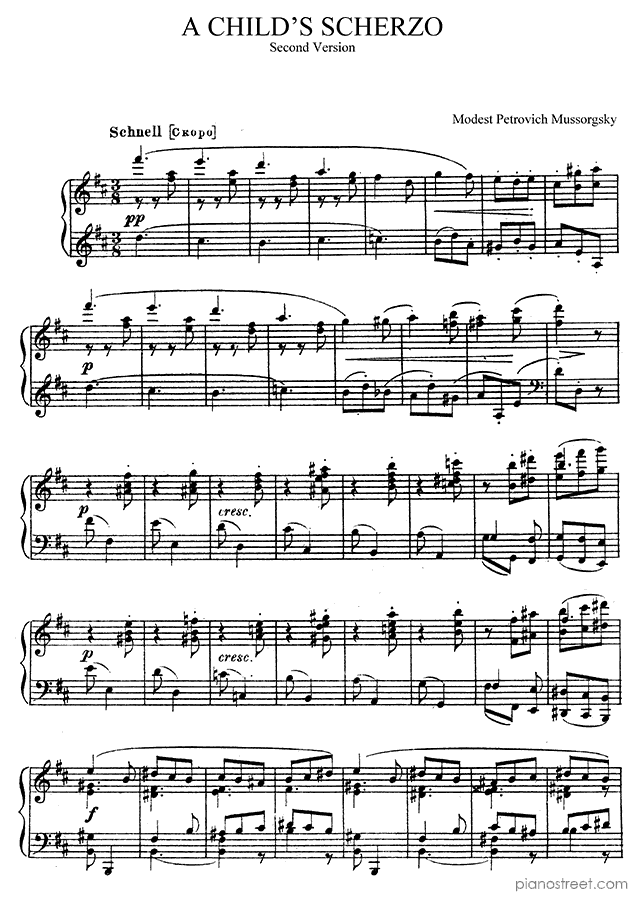 Mussorgsky: A Child's Scherzo - Second Version in D Major (published in 1860) . DOWNLOAD piano sheet music from Piano Street digital sheet music library.